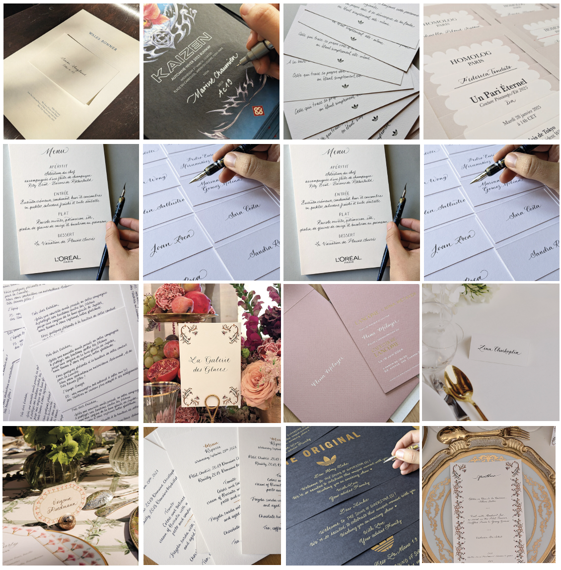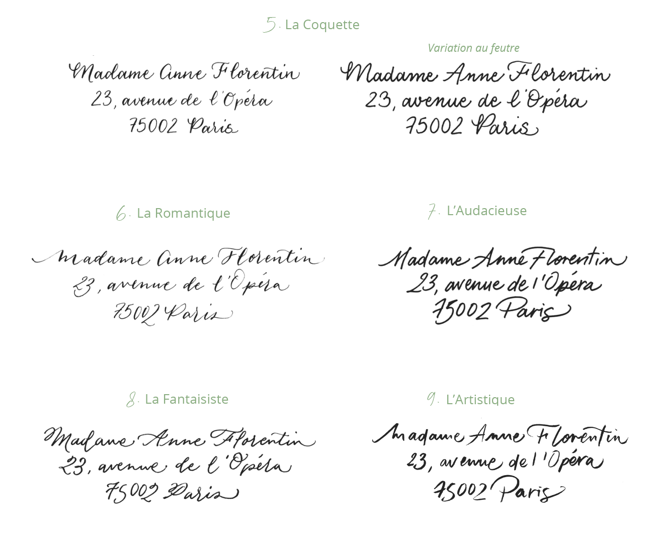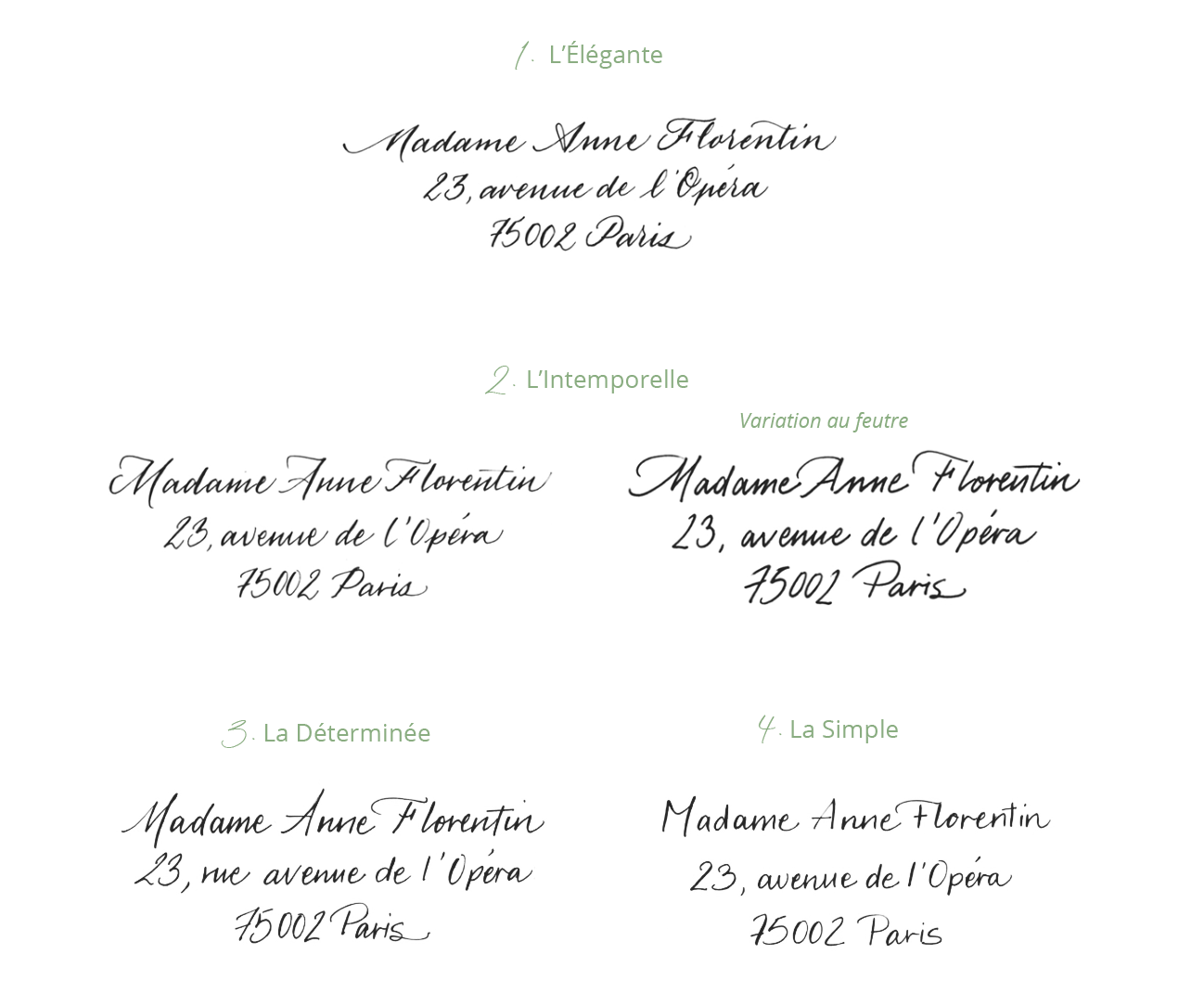 Le Studio propose différents styles de calligraphies pour dactylographier vos textes sur différents supports (enveloppes, invitations, carton-réponse, colis, marque-places, plan de table, cadeaux d’invités…).