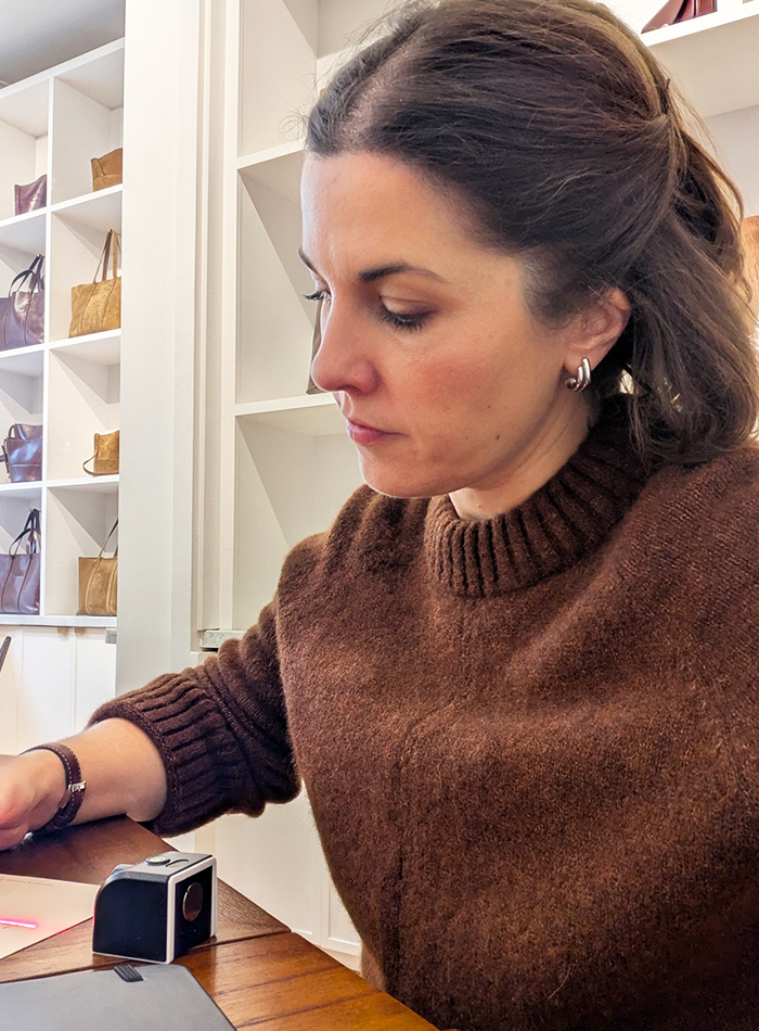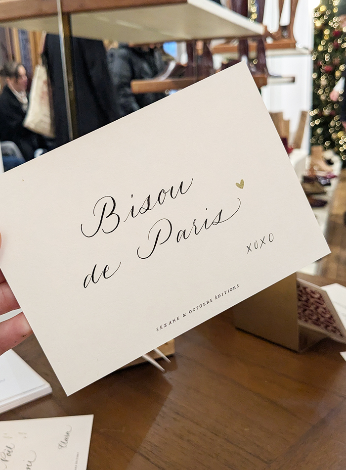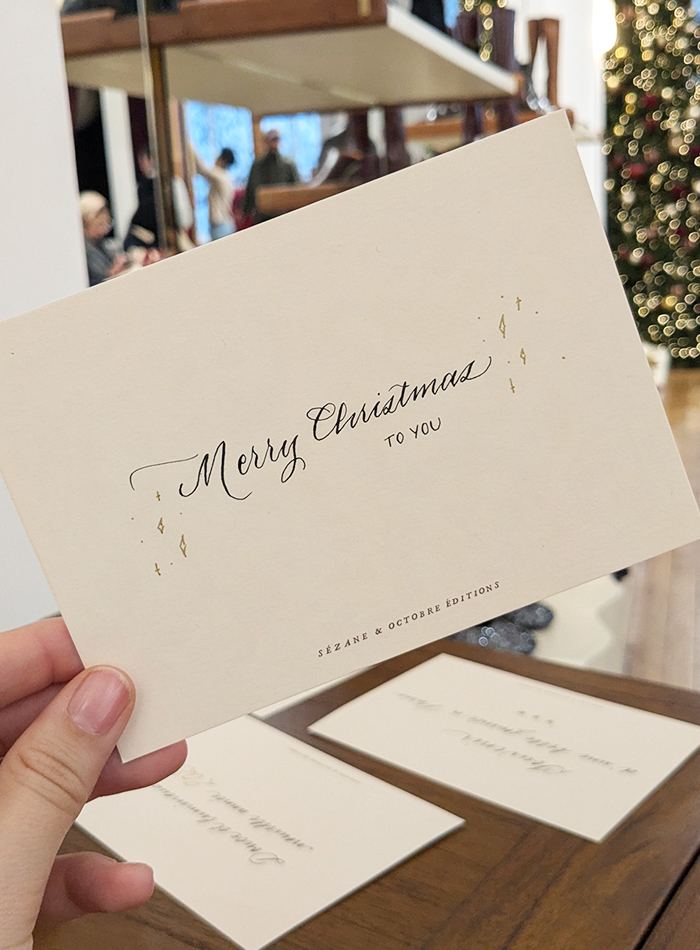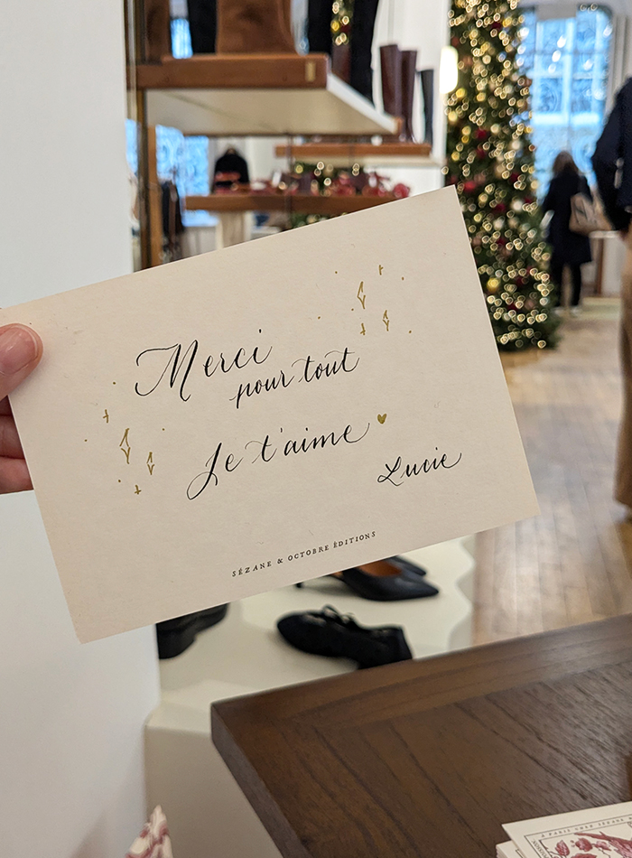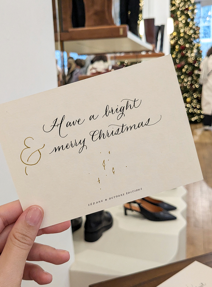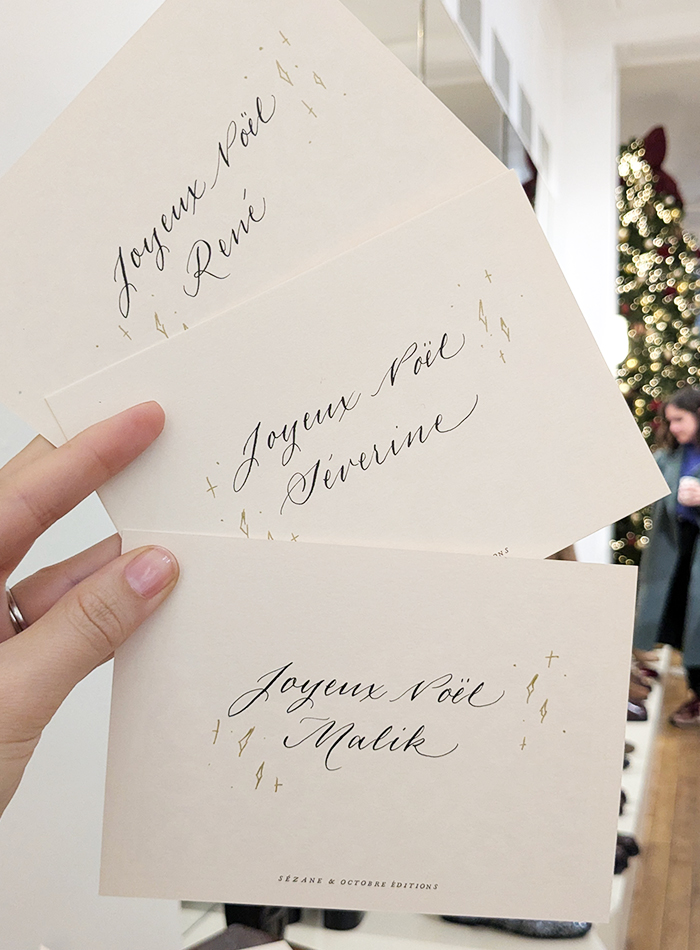Calligraphie en boutique de cartes pour les fêtes de fin d'année pour les clients de L'Appartement Sézane à Paris tous les weekend de novembre et décembre.