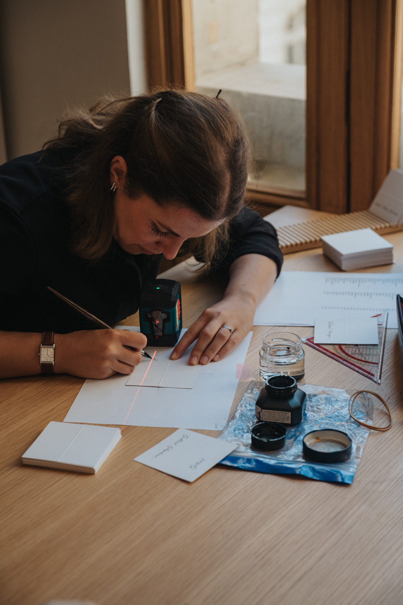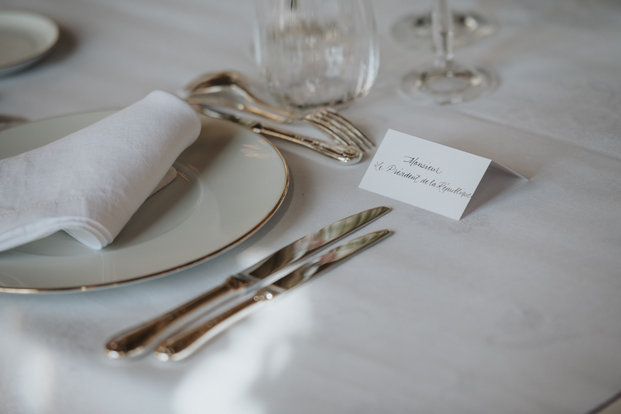 Calligraphie à la plume des marque-places pour le déjeuner et le dîner de gala du sommet Choose France organisé par la Présidence de la République au Château de Versailles.